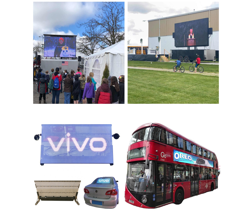 The most common ones are the taxi LED signs, mobile LED trailers, etc. The feature of mobile anytime makes it possible to appears in many places, such as streets, timing, drive-in ceremony during Pandemic, and other events.