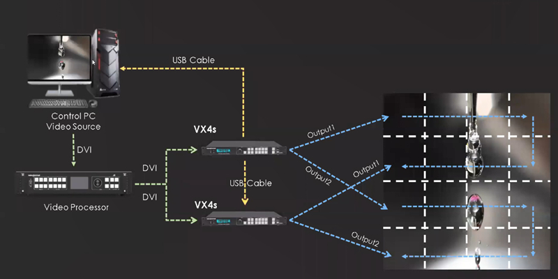 Because of the limitation of loading capacity, we use two VX4S LED controllers here. According to the content about LED display cascading connection we discussed before, it is apparent that these two controllers are cascading as they are managed by one USB cable.