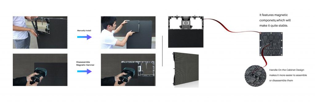 Xingwei MA500 Series LED display with frontal service. The magnet LED modules can be removed by tools on the front side for only 5 seconds. Easy and convenient, save your cost and labor.