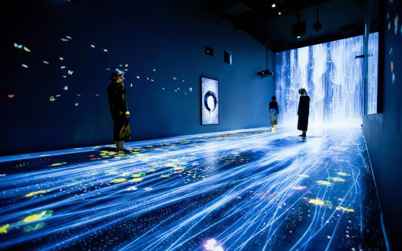 The ground projection system projects images onto the ground using projection equipment suspended from the top. When the visitors walk through the projection area, they can interact with the virtual scene on the projection screen through the system identification. Ground projection is a form of VR(Virtual Reality) technology. It makes people seem to be in a real environment.